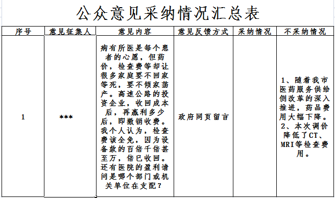 我局就《惠州市公立醫(yī)療機構(gòu)醫(yī)療服務(wù)項目價格調(diào)整方案(征求意見稿)》于2020年10月28日至2020年11月28日通過市政府門戶網(wǎng)站、市醫(yī)療保障局電子信箱、來電、來函等方式向社會公開征求意見。公開征求意見期間,共收到1位市民意見,對社會公眾提出的意見和建議,我局高度重視,現(xiàn)將向社會公眾征求意見的采納情況公開,具體的采納情況詳見附件。