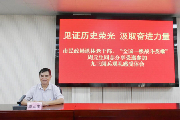 周元生同志曾任“狼牙山五壯士連”指導員,在南疆戰斗中時任“密云尖刀連”連長,三打探某時,他帶領全連英勇戰斗,戰果顯著,連隊榮獲集體一等功,被原廣州軍區授予“探某攻堅英雄連”稱號,其所在營被中央軍委授予“攻堅英雄營”稱號,個人榮立一等功,被中央軍委授予“全國一級戰斗英雄”稱號。轉業到惠州工作后,周元生不忘初心、牢記使命,繼續保持軍人本色和良好作風,在各項工作中表現突出,先后多次被市委市政府和有關部門表彰。
