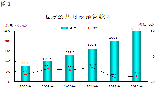 全市地方公共財政預算收入250.1億元,增長24.5%;地方公共財政預算支出328.1億元,增長19.7%。其中,教育支出72.6億元,增長16.0%;社會保障和就業支出26.8億元,增長21.9%;醫療衛生支出26.3億元,增長20.5%;節能環保支出28.6億元,增長281.1%;農林水事務支出26.5億元,增長0.5%。稅收總收入728.7億元,增長3.5%。其中,國稅522.6億元,下降1.3%,國稅中的國內稅收收入342.2億元,增長12.5%,國稅中的海關代征稅180.5億元,增長-19.9%;地稅206.1億元,增長17.9%。