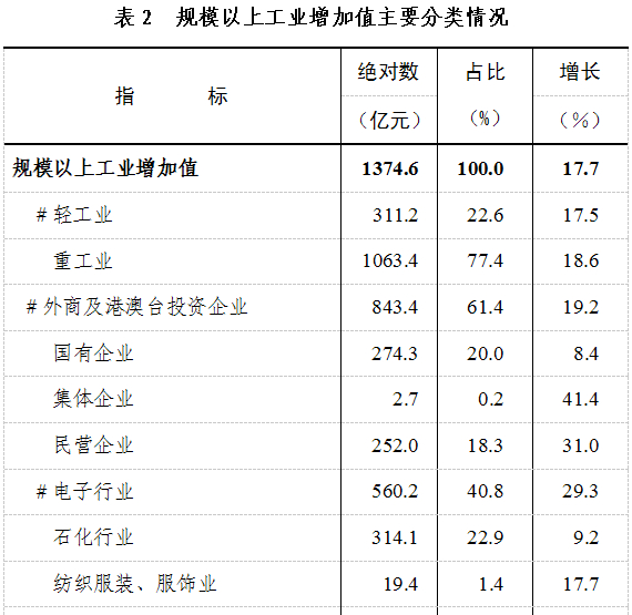 全年規模以上工業企業1459家,實現增加值1374.6億元,比上年增長17.7%。分行業看,電子行業完成增加值560.2億元,增長29.3%;石化行業完成增加值314.1億元,增長9.2%。電子行業、石化行業增加值占規模以上工業增加值的比重分別為40.8%、22.9%。分企業類型看,外商及港澳臺投資企業增加值843.4億元,占規模以上工業增加值比重為61.4%,增長19.2%;國有企業增加值274.3億元,占規模以上工業增加值比重為20.0%,增長8.4%;民營企業增加值252億元,占規模以上工業增加值比重為18.3%,增長31%。規模以上工業企業實現銷售產值6399.1億元,增長17.3%,其中,內銷產值3992.8億元,增長20.2%;出口交貨值2406.3億元,增長12.8%。內外銷比例為62.4:37.6。