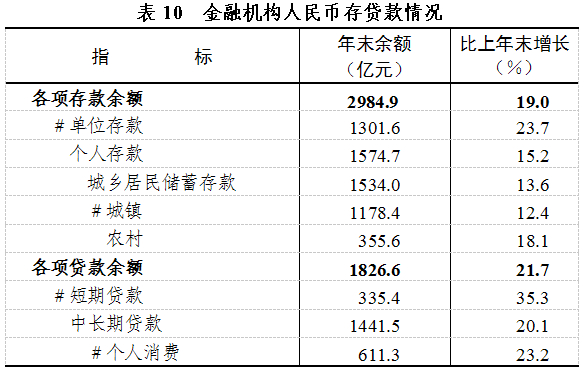 年末全市金融機構本外幣存款余額3138.8億元,比上年末增長16.4%。其中人民幣各項存款余額2984.9億元,比上年末增長19.0%。全市金融機構本外幣貸款余額2036.9億元,比上年末增長17.4%。其中人民幣貸款余額1826.6億元,比上年末增長21.7%。